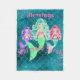 Cute personalized mermaid fleece blanket with three mermaids long hair purple, teal, hot pink in a teal background. Option to personalized the text is available. Design © by Nayda Liz Rivera