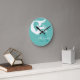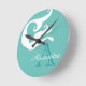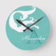 Designed by Sandy Closs part of the ocean-themed decor. Personalized with name monogram White mermaid on Aqua Teal blue Round Clock.