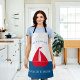 Stunning nautical red white and blue apron featuring a red boat on a white and blue colorblock background , with a two text templates where you can add your family name and boat house , summer home or even cottage or a business , very easy to personalize and make it your own.