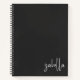 This chic black modern notebook features your name in a white handwritten script calligraphy on a black background. The typography is stylishly placed in the lower right corner. Perfect for office, dorm, back to school, or business. A sophisticated minimalist style in black and white.