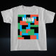A modern abstract T-shirt with patterned with interlocking geometric shapes in red, green, black and orange. The colorful geometric pattern has a computer game appearance, ideal for gamers and tech lovers. Personalise with a name in white capital lettering near the top of the design.