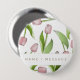 The product design features a pattern of pink tulip flowers. This botanical illustration with personalized text make a modern and unique button - Gift idea for birthday, Easter, Mother’s Day, bridal shower, wedding favors, and more!