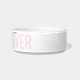 Bubblegum pink cat bowl with "BEST CAT EVER" and your cat's name customized in a chic and elegant calligraphy script font text overlay. Enter any personalized text you like for the background and top layer of text to create your own personalized pink ceramic pet food or water bowl. See our collection of coordinating bowls and get a set!