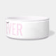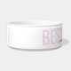 Pink, black, and white dog bowl with gray "BEST DOG EVER" and your dog's name customized in a chic and elegant calligraphy script font text overlay. Enter any personalized text you like for the background and top layer of text to create your own pink personalized modern and minimal and fun ceramic pet food or water bowl. See our collection of coordinating bowls and get a set!