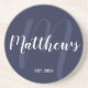 featuring family name in white modern script font style and monogram in light navy blue modern script font style as background