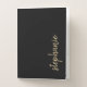 Personalize this elegant modern design with your name in vertical gold signature handwriting script on a black background