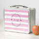 Introducing the Metal Lunchbox, a perfect blend of modern style and retro charm. This trendy lunchbox features a watercolor pink striped background that adds a touch of elegance to any mealtime. The highlight of this lunchbox is the circle monogram design, which can be personalized with your name at the top and bottom, while the middle showcases an initial template. It's not just a lunchbox; it's a statement piece that reflects your unique personality. Whether you're a busy mom or a trendy child, this metal lunchbox is the perfect companion for school, work, or any on-the-go adventure. Stand out from the crowd with this stylish and practical lunchbox that effortlessly combines fashion and function.