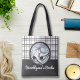 The design features a pair of ice skates over a snowflake crest and an off-white tartan pattern background. This elegant winter sports design serves as a cute modern and unique tote bag with personalized text. Gift Idea for figure skater, ice dancer, speed skater, and more!