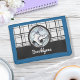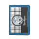 The design features a pair of ice skates over a snowflake crest and an off-white tartan pattern background. This elegant winter sports design serves as a cute modern and unique wallet with personalized text.