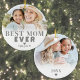 Best Mom Ever Personalized Christmas Photo Ornament. This custom ornament is a meaningful way to celebrate Mom during the holiday season. Featuring a different photo on each side, it's a heartfelt keepsake that captures favorite memories and adds a personal touch to your Christmas tree. The front showcases "Best Mom Ever" in soft gray, modern typography over a cherished photo—perfect for a sweet moment between Mom and her kids.