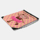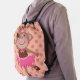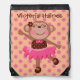 Cute drawstring backpack, great for little monkeys and little ballerinas of any age, features a smiling brown monkey ballerina in a pink and brown tutu and ballet slippers and an area you can easily personalize with a name. The background of the bag is light peach with pink polka dots.