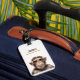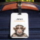 Inject a dose of humor into your travel essentials with this charming and personalized monkey luggage tag. The image captures a realistic monkey in crisp detail, sporting a stylish pair of sunglasses that reflect a serene sky. Just below this whimsical figure, the name 'James' stands out in a bold font and color, ready to be customized to your preference. This unique tag not only ensures your luggage is easily identified but also brings a smile to the face of fellow travelers.