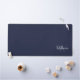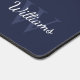 features personalized name in white script font style and monogram in light navy blue serif font style as background, on navy blue background.