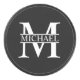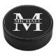 featuring personalized white monogram in classic serif font style with box of name in the middle of monogram on black background.