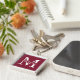 featuring personalized white monogram in classic serif font style with box of name in the middle of monogram on burgundy red background.