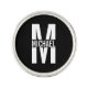 featuring personalized monogram in white bold modern sans serif font style with box of name in the middle of monogram on black background.
