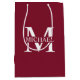 featuring personalized white monogram in classic serif font style with box of name in the middle of monogram on burgundy red background.