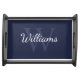 features personalized name in white script font style and monogram in light navy blue serif font style as background, on navy blue background.
