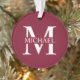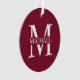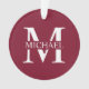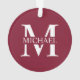 featuring personalized white monogram in classic serif font style with box of name in the middle of monogram on burgundy red background.