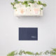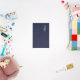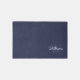 features personalized name in white script font style and monogram in light navy blue serif font style as background, on navy blue background.