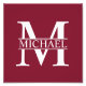 featuring personalized white monogram in classic serif font style with box of name in the middle of monogram on burgundy red background.