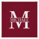 featuring personalized white monogram in classic serif font style with box of name in the middle of monogram on burgundy red background.