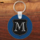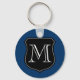 Personalized monogram keychain with letter emblem shield. Elegant initial letter with customizable dark blue background color. Cool gift idea for men and boys.