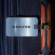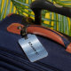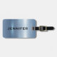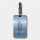 Design a one-of-a-kind luggage tag featuring your name and contact information against a sleek metallic blue background. Stand out from the crowd and make a statement with your personalized tag.