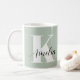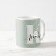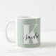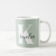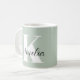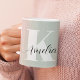 Personalized sage green mug featuring your monogram initial in modern large white typography and your name in a stylish calligraphy signature script.