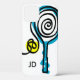 Personalized monogram tennis racket iPhone 12 case. Cute monogrammed phone cover design with your name initial letters. Sport art drawing of tennis racquet and ball. Customizable for sporty men women and kids. Birthday gift idea for player, fan and coach.