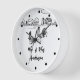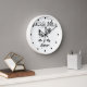 This black and white Mr. & Mrs. clock features two chickens, a rooster and hen in love. They are set against a charming line drawing country farm. It can be personalized with a surname or any text that you wish to add.