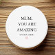 "Delight and celebrate the amazing mum in your life with this personalized mini candle favor. Perfect for Mother’s Day, birthdays, or simply to show appreciation, this charming candle gift features a heartfelt 'MUM You Are Amazing' message and can be customized with her name or a special note to make it truly unique. With a stylish design and a personal touch, it’s a beautiful keepsake for mums who light up your life. Great for gifting individually or as part of a gift set, this mini candle favor is a small gesture that speaks volumes."