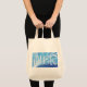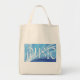 Personalized music tote with the word MUSIC on a blue swirl background for music class supplies or music teacher, an elegant bag to carry your sheet music, instruments, or other supplies. Customize the name text to your name, or select and delete it if you don't need it.