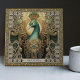 Designed in a unique palette of dark green, brown, gold, and dark aquamarine, the art piece subtly reflects the look of a vintage altarpiece. The centerpiece, a peacock adorned with tribal jewels, symbolizes a spirit animal that represents a loved one, family member, or friend, and brings forth qualities of integrity, beauty, and self-expression. This tile, imbued with such significance, transforms into more than just decor—it becomes a meaningful connection to your cherished relationships.