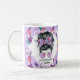 Cool personalized coffee mugs for nail techs. Great Gifts for your favorite nail technician. Make your manicurist smile with this cute messy bun design with purple and nail polish bottles.