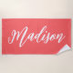 personalized beach towel custom gift, personalized name bath trip towel, custom pool towel for summer, custom beach towel with name, outside birthday vacation trip gift, custom beach towels personalized towel, vacation gift personalized beach towel, custom name towel customized towel, custom towel bridesmaid gift present, best birthday gift personalized towel, coral pink beach towel, bright easy to read beach towel, fun vacation trip towel, pretty beach towel