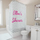 Personalized name chevron pattern shower curtains. Elegant grey chevron zigzag pattern shower curtain with neon pink text template. Stylish script typography. Zig zag stripe bathroom accessories for men and women. Cute print design. Custom size and color. Trendy home decor.