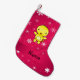 Perfect! Exactly what I ordered! I uploaded a picture of my blue chow, and the screen print was incredible. the back side of the stocking was the red and black checkered print. my puppy's name was also printed on the cuff of the stocking. PERFECT! Highly recommend this product! My puppy's name was screen printed onto the cuff of the stocking, the font was perfect!