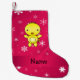Create your own custom Personalized with just add your name (family name),monogram, greeting or initials or saying cute cartoon chicken with a pink snowflakes Christmas pattern background and pink stripe. Cute chicken Christmas gift ideas.