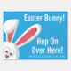 Let the Easter Bunny know to stop by your house with this personalized yard sign. Features the Easter Bunny peeking in the corner and says "Easter Bunny! Hop On Over Here!" With an optional line to add the names of your children. This adorable and funny Easter yard sign can be used for years to come!