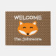 Personalized name cute red fox polka dots door mat. Brown nature colors. Forest animal vector design. Make your own custom monogrammed with custom color polka dots background. Add your own welcome message, family name, monogram, surname or funny quote. Cute gift idea for friends, newly weds and family with new home / housewarming party. Custom color polkadots background. Elegant chic script typography. Personalizable doormat sign template. Create your own entry mat / rug for front door / entryway or hall / wedding venue, porch, garden etc. Customizable outdoor home decor / decorations for your lake house. Available in small and big large size. Fun animal illustration for adults and kids.