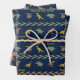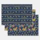 A set of three coordinated dinosaur gift wrap sheets in blue, yellow and green. Easily personalize the name and greeting with just a few clicks.