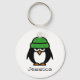 Personalized name keychain for penguin lovers. Funny winter penguin cartoon. Cute animal design with green hat on. Fun birthday gift for kids.