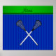 Modern and trendy lax sports lacrosse sticks with blue stripes pattern background and green stripe personalized with just add your name gifts or monogram gifts or your initials for a unique gift. Sports gift ideas for men and boys and girls. Ideal for birthdays.