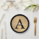Personalize these gold metallic look button outlined in black round paper plates with any surname and single custom monogram.