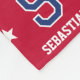 Cuddle up with a sports jersey-style blanket! This all-over pattern features a retro block font, stars, and is personalized with a monogram initial and name — perfect for individual names, family surnames or pet names. You can also customize the background color by using the design editor tool. Custom fleece blankets are great for staying warm and cozy, and make a fun and useful gift for kids, teens, family, friends and loved ones. Printed colors: crimson red, dark blue navy and white.