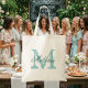 Personalized name monogram tote bag | Turquoise blue / teal green color. Elegant logo design with monogrammed letter initials. Cute vintage gift idea for bride and bridesmaids at weddings.