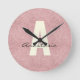 Personalized Name Pink Rosegold Sparkle Glitter Round Clock Template. A modern and feminine design perfect as custom gift for her. Bridesmaid, Girlfriend, Daugther, Friends, Co-workers and Employees will be happy to receive this trendy gift!