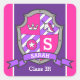 Personalized short name princess style royal knights shield school or college name and class stickers, part of the coat of arm shield crest kids name range. Customize with your own name, initial and class. Currently reads S Sarah Class 3R. Ideal to label back to school items and books. Original art, featuring a unicorn's head, heart tiara and star coat of arms crest design by Sarah Trett for www.mylittleeden.com