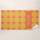 This personalized beach towel features a bold mid-century modern inspired pattern in warm golden yellow and burnt orange, complete with a custom name in elegant script. Ideal for summer vacations, poolside lounging, or retro-themed party favors. A stylish and functional gift for design lovers and beachgoers alike.